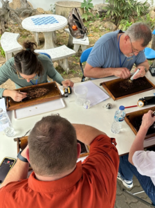 Coaching members (Alyssa Piccolomini, State Entomologist for Montana, Mike Studer, Apiary Inspector for Tennessee, and Kim Skrym, Apiary Inspector for Massachusetts) uncapping brood cells to look at creating tropilaelaps mites. Photograph through. Dr. Geoffrey Williams.