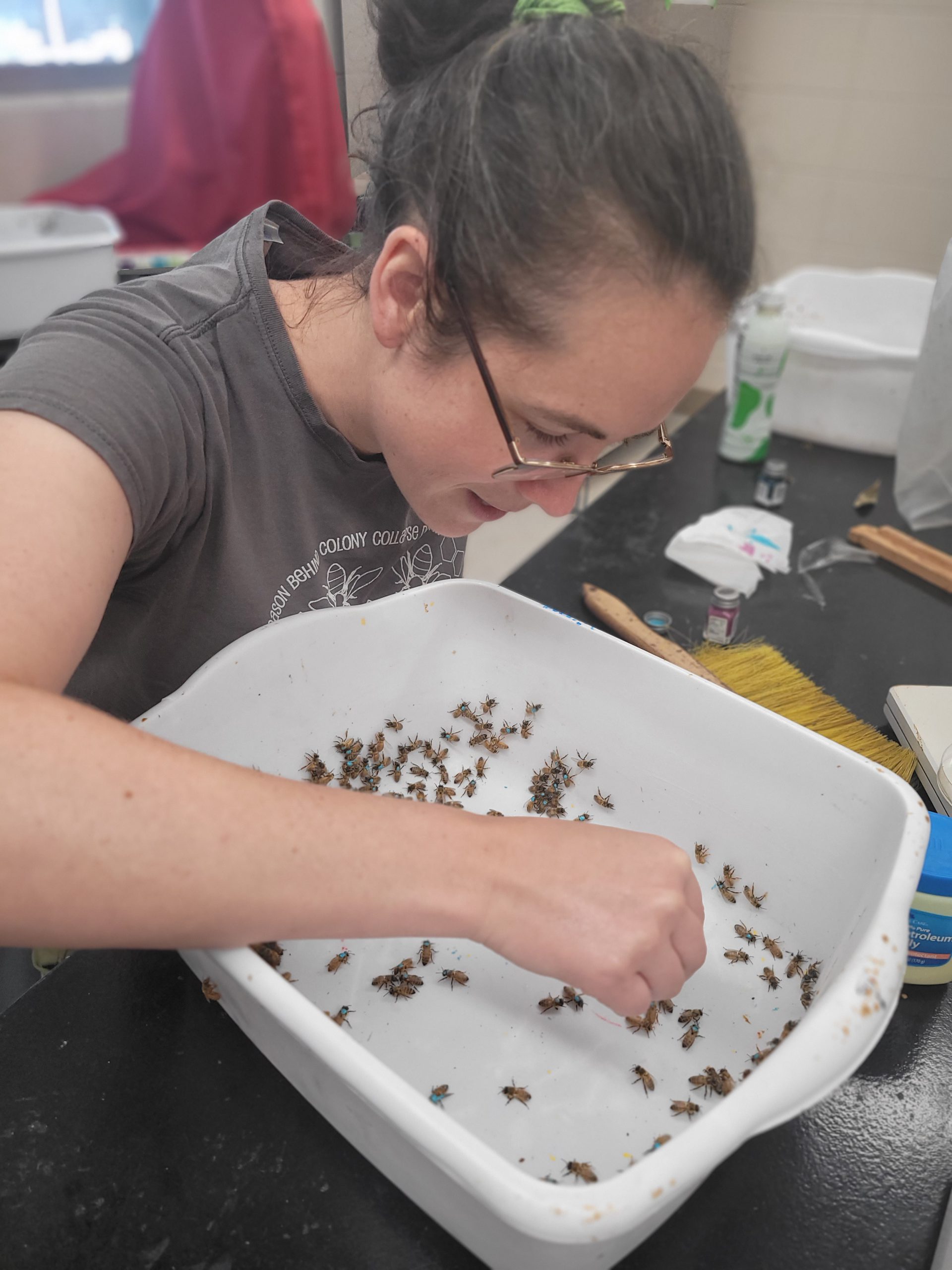 Elizabeth (Liz) Walsh, Ph.D., marks one-day outdated bees with paint—or, as she calls it, “Picassoing” them—for an age-dependent learn about. (Picture via Mike Simone-Finstrom)