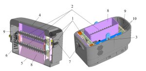 Notes: 1 – a collection of gears; 2 – decrease and higher pair of shafts, protrusions of which are compatible one-to-one; 3 – an electrical motor; 4 – a hollow for putting nets with propolis; 5 – an outlet; 6 – an electrical cable; 7 – a transfer; 8 – a protecting chamber; 9 – an influence cable compartment; 10 – a steel body