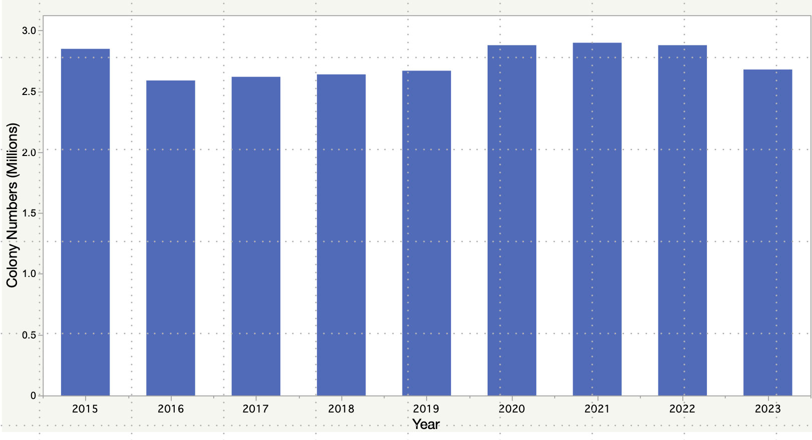 Remaining month, I centered from throughout the field at the attractiveness and productiveness of honey bee colonies, and the portions that should paintings in combination to stay issues humming. Now it’s time to seem down (on occasion actually, within the type of satellites) at U.S. bee colonies and spot what we will be able to glean from a distance. It’s widely known that honey bee colonies fail at a considerable price every yr. Previously 9 years of knowledge from the USDA’s nice Nationwide Agricultural Statistics Carrier Honey Bee Colony Document (https://www.nass.usda.gov/Surveys/Guide_to_NASS_Surveys/Bee_and_Honey/), losses have remained stubbornly consistent. From 2015 to 2023, colony losses averaged an astronomical 53% in keeping with yr. Even in the most productive yr (2023) losses had been 46%, imputed from the primary part of the yr (watch the NASS website for the newest knowledge every August). 1.5 million misplaced colonies every yr represents a large number of bees and anguish. Thankfully, beekeepers have fought again in opposition to those losses, and the online colony numbers for that very same length have no longer modified a lot in any respect (see determine 1), maintaining stable at 2.75 million colonies/yr when recording beekeepers with 5 or extra colonies. This has been a dear struggle however has allowed bees to proceed to play massive roles in agriculture and economies from the yard to the most important farms. A up to date paper by means of Kirti Rajagopalan and associates from Washington State College and USDA (together with longtime honey bee well being researcher Gloria deGrandi-Hoffman) has pulled in combination a vintage colony enlargement and prosperity type for honey bees (VARROAPOP) with present and long term local weather tendencies to present a in point of fact distinctive view of the way and why the weather can engage with illness and diet to affect bee well being (Rajagopalan, Okay.; DeGrandi-Hoffman, G.; Pruett, M.; Jones, V.P.; Corby-Harris, V.; Pireaud, J.; Curry, R.; Hopkins, B.; Northfield, T.D. Hotter Autumns and Winters may just scale back honey bee overwintering survival with possible dangers for pollination services and products. Clinical Stories 2024, 14, 5410, doi:10.1038/s41598-024-55327-8). One of the most takeaways, in all probability acquainted to these retaining bees in a lot of the U.S., is that gentle climate isn’t all the time an excellent factor for bees. By way of appearing the affects of longer, hotter Fall seasons the authors reveal that bees prepping for Iciness do higher when the transfer comes temporarily than when the ones bees are triggered to spend every other month out searching for declining forage. Strangely, an early Spring isn’t all the time a excellent factor both, partially as a result of no person loves Spring up to the small inhabitants of overwintering Varroa mites. There’s a lot to contemplate on this paper. The effects practice from Tulsa to Toledo and for beekeepers bearing in mind the entire choices for containing their bees over Iciness.