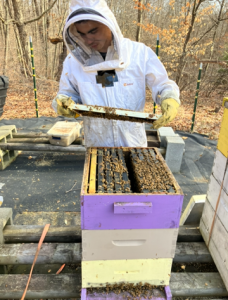 Devon Zapatka inspects the frames totally, taking a look searching for indicators of the queen repopulating the colony within the early spring at an apiary on Platt Highway in Watertown. (Courtesy of Devon Zapatka)