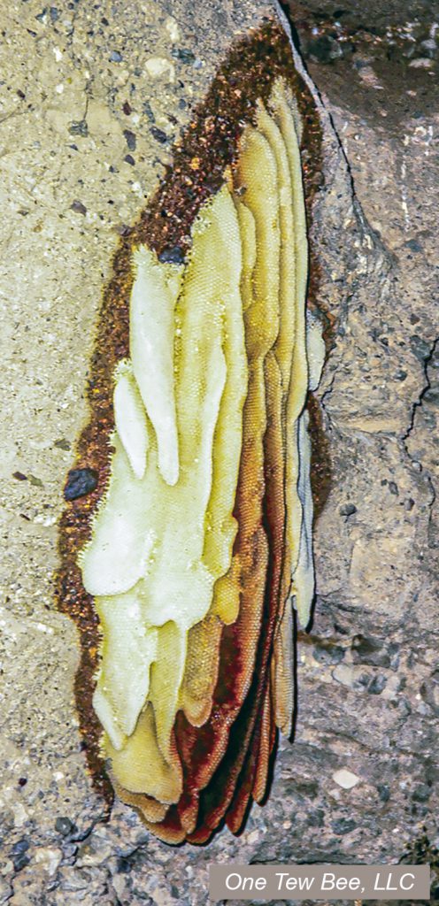 Determine 2. What a honey bee nest seems like with out beekeeper involvement. Observe the propolis band across the combs.