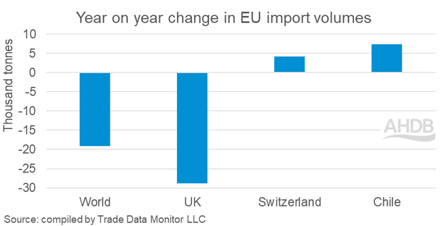 “Even though the diminished shipments from the United Kingdom are principally all the way down to falling home provide, prime pricing has now not aided festival at the international marketplace. In the meantime import volumes from Switzerland and Chile to the EU grew 12 months on 12 months expanding their marketplace percentage from 7% and a pair of% respectively in 2022 to 11% and eight% in 2023 respectively,” Ms Shuttleworth mentioned.