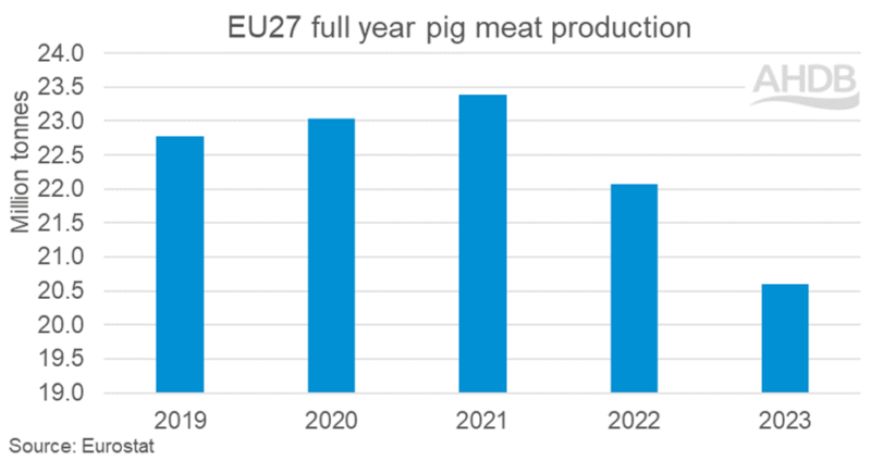 EU pigmeat manufacturing ultimate 12 months used to be the bottom quantity recorded in over a decade, at 20.6 million tonnes, a 7% decline 12 months on 12 months, following a 6% fall in volumes in 2022. Those declines were pushed via diminished slaughter numbers which might be additionally again 7% 12 months on 12 months.