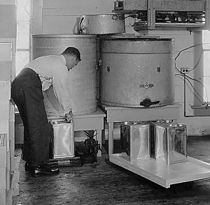Determine 1. Filling 60# honey tins. Observe A.I. Root honey settling tanks