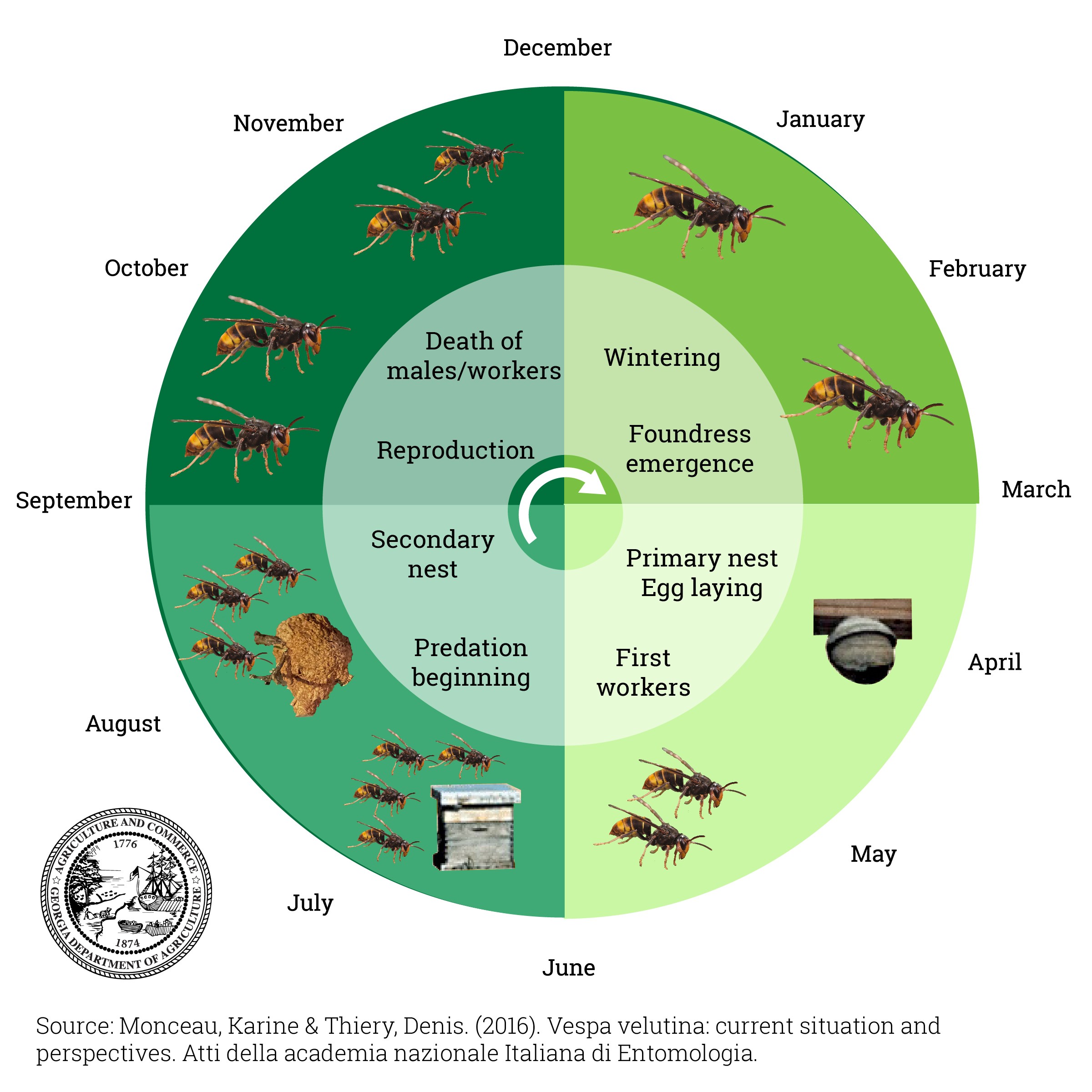 Here’s a diagram illustrating the lifestyles cycle of the yellow-legged hornet. Recently, they’re progressing as anticipated and beginning to assemble secondary nests.